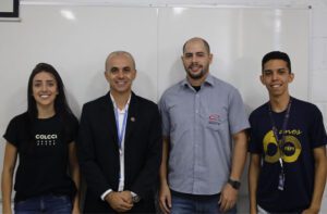 Na foto: Isabela Beatriz – Graduada em Educação Física, Prof. Alexandre Souza e Silva – Coordenador do curso de Educação Física, Francisco Coelho de Souza – Representante do CREF6/MG e Marcelo Augusto Fernandes – Graduado em Educação Física